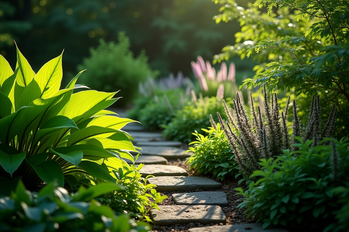Un jardin ombragé peut devenir un véritable havre de paix en jouant sur les contrastes de feuillages et de textures. Associez les fougères aux heuchères pour un effet graphique saisissant. Les hostas aux grandes feuilles arrondies apporteront une touche de majesté. Utilisez des plantes comme les pervenches et les géraniums vivaces pour couvrir le sol de manière élégante.
